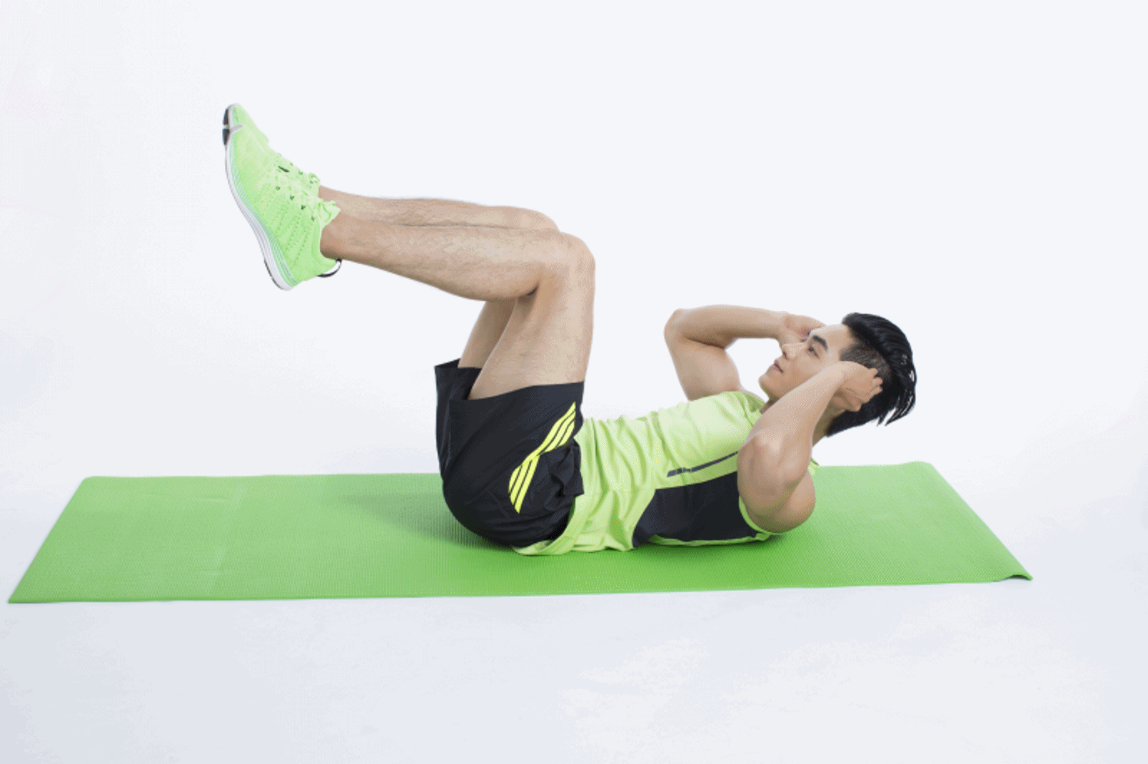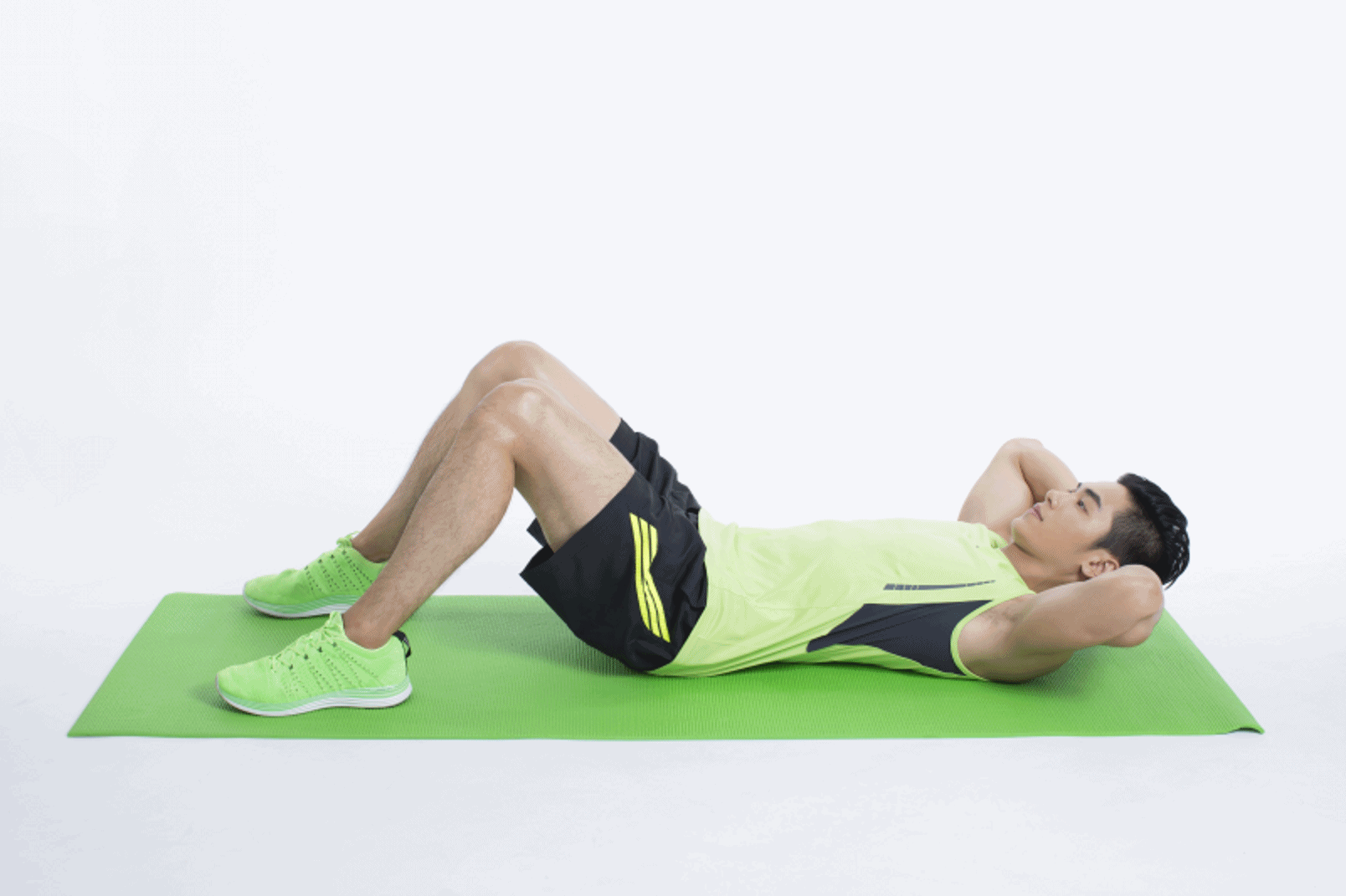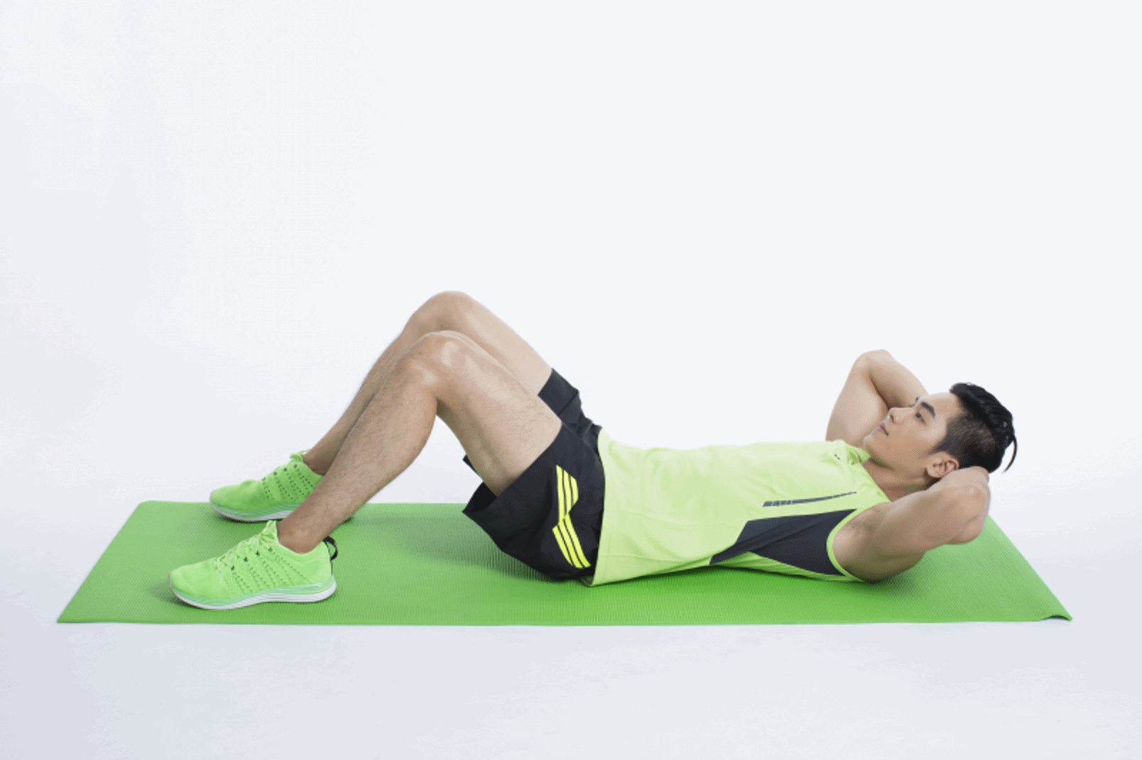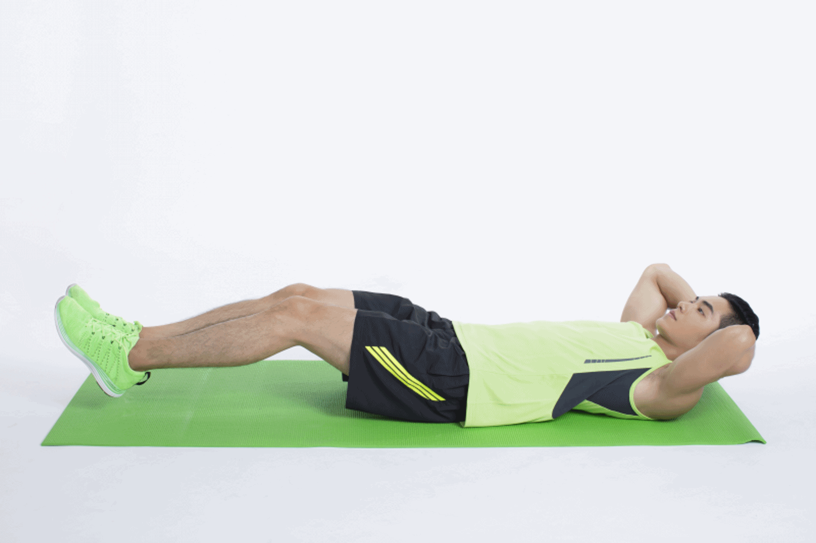 Tư thế chuẩn bị: Nằm trên thảm sao cho lưng và mông tiếp xúc với mặt sàn; chân không chạm mặt đất và gót chân cách đất 5 cm; hai tay để sau gáy và hướng đầu về phía trước.