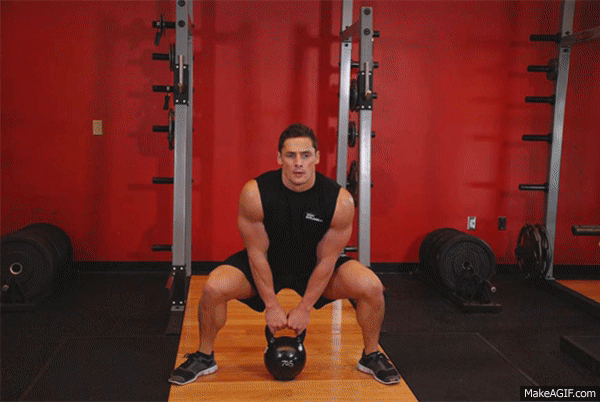 + Đặt 1 tạ bình vôi kettlebell ở trên sàn giữ hai chân. Hai chân đứng giang rộng, hai tay nắm chặt tay cầm của tạ. Đẩy hông về sau càng nhiều càng tốt, hai gối khuỵu xuống. Giữ ngực và đầu hướng lên.