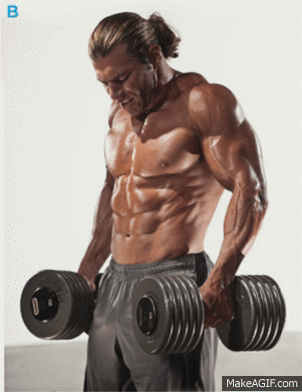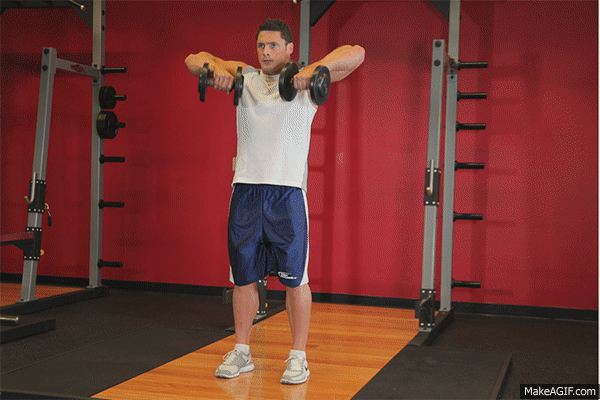 + Dùng hai vai bên để nâng hai tạ tay lên khi thở ra. Giữ hai tạ gần thân người khi di chuyển tạ lên và kéo hai cùi chỏ lên. Tiếp tục cho tới khi nào gần chạm cằm. Mẹo nhỏ: hai cùi chỏ sẽ kéo lên theo với chuyển động. Khi nhấc tạ tay, hai cùi chỏ sẽ luôn cao hơn hai cẳng tay.