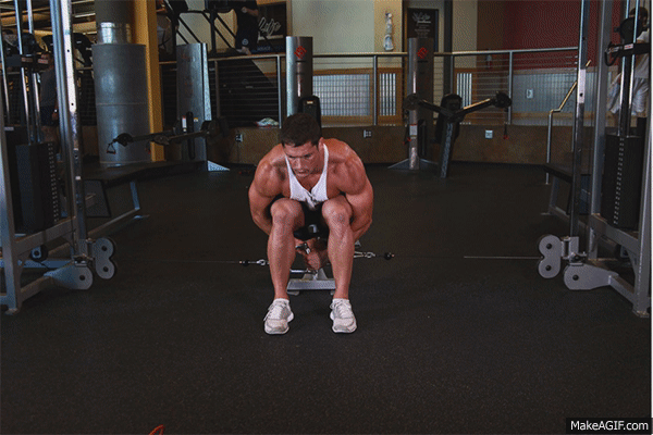 + Đứng giữa hai máy kéo cáp, ròng rọc thấp, đặt 1 ghế thẳng ngay sau bạn. Lựa chọn mức tạ phù hợp.