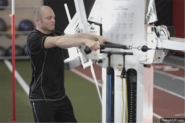 + Đứng ra xa khỏi khung kéo cáp sao cho hai tay duỗi thẳng và căng cứng cơ cầu vai. Từ từ kéo hai cáp về phía mặt, hai cùi chỏ duỗi hai bên thân người, ngang vai. Thở ra khi thực hiện.
