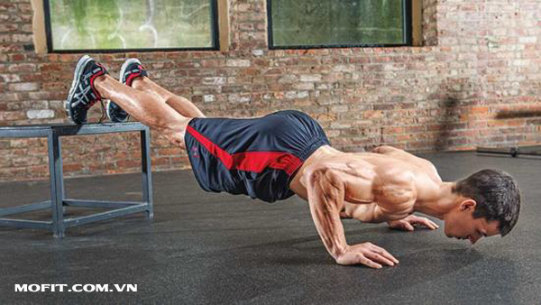 Đặt chân cao trên 1 chiếc ghế, nghiêng người xuống và hít đất liên tục trong 3 hiệp, mỗi hiệp 10 lần. Việc thay đổi góc tác động này sẽ giúp bạn tập hít xuống sâu hơn và tác động vào ngực dưới nhiều hơn.