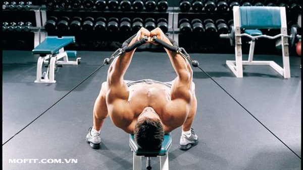 Nằm trên ghế bench, 2 tay nắm lấy đầu dây tạ. Bắt đầu thực hiện động tác, 2 tay kéo 2 đầu dây đến khi 2 tay chạm vào nhau (như hình trên) thì từ từ thả về vị trí ban đầu. Thực hiện động tác trong 3 hiệp, mỗi hiệp 15 lần. Động tác giúp ngực trong săn chắc hơn.